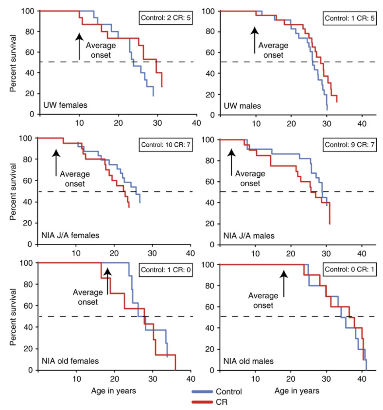 The impact of CR has also been examined in primates, specifically rhesus monkeys, with two studies run almost in parallel starting in 1987. A 20-year longitudinal study by Coleman et al., at the University of Wisconsin demonstrated delayed disease onset and mortality. The study showed that moderate CR (30% deficit vs. control) reduced the incidence of age-related death at the time of reporting (at follow-up, 80% of CR animals survived, compared to 50% of controls). In addition, they observed a delay in the onset of age-related diseases, such as, diabetes, cancer, cardiovascular disease and neurodegeneration. However, 23-year study by Mattison et al., conducted at the National Institute of Aging (NIA), reported some improvements in overall health but not in the lifespan of the monkeys. Comparison between the two studies is challenging as there were considerable differences in a number of aspects of the studies, including differing dietary intakes, sex and environmental factors (discussed here).