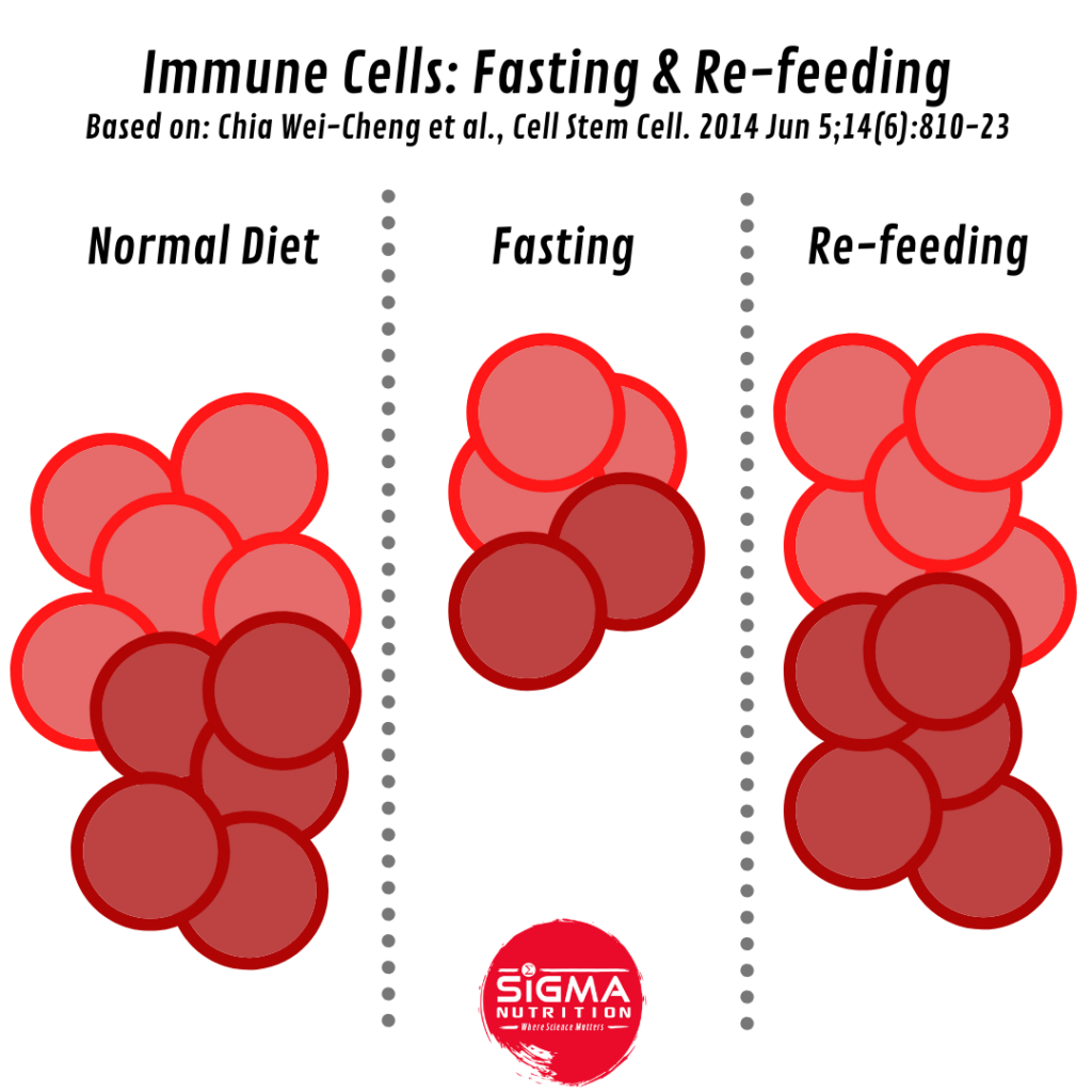 Other impacts of prolonged fasting (48–120 hours) have been considered. It has been shown that extended fasts in mice lead to acute decreases in immune cells, however they are restored upon refeeding. This is suggested as an advantage; i.e. the cycles of prolonged fasting and re-feeding promote stem cell self-renewal to reverse immunosuppression. However, implications for humans are difficult to know, owing to the complexity of the immune system and the need for more research.