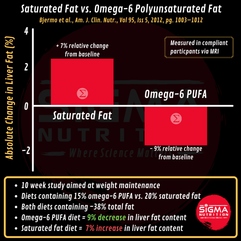 A number of eucaloric intervention studies have been conducted comparing carbohydrates vs. fats, and comparing different fat subtypes, for effects on liver fat. In the HEPFAT trial, the effects of a diet containing 15% omega-6 PUFA was compared to that of 20% saturated fat (with both diets containing the same total fat of ~38%), over 10 weeks, with diets aimed at maintaining weight. While weight increased non-significantly by 0.4kg and 0.8kg in the PUFA and saturated fat groups, respectively, the omega-6 PUFA diet resulted in a 9% decrease in liver fat content, while the saturated fat diet resulted in a 7% increase. Increases in circulating serum linoleic acid (an omega-6 PUFA) levels were shown to correspond to the reduction in liver fat in the PUFA group, while increased liver fat positively correlated with greater circulating saturated fatty acids. While the study was conducted as a free-living intervention, and therefore it is possible that the diets may not have been fully complied with, the study demonstrated that in the absence of weight loss, higher omega-6 PUFA resulted in decreased liver fat while higher saturated fat increased liver fat content.