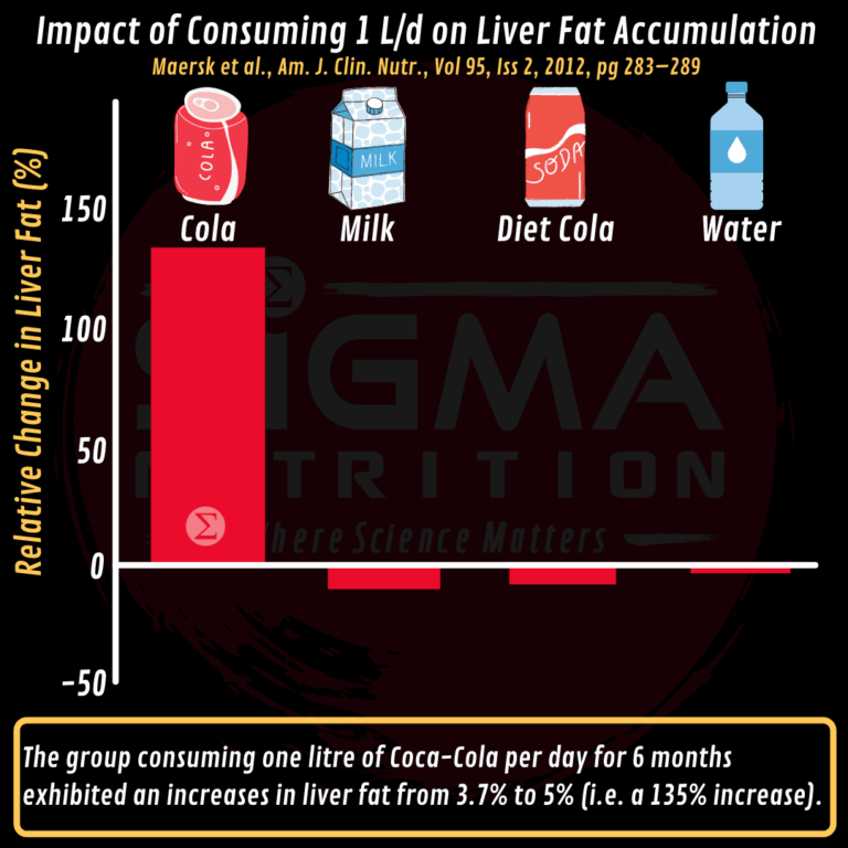 The group consuming one litre (1L) of Coca-Cola per day exhibited significant increases in liver fat, from 3.7% to 5%. However, this was not a like-for-like comparison in terms of the dose of sugar between the calorie-containing beverages, given that milk had less than half the sugar content of the Coca-Cola.