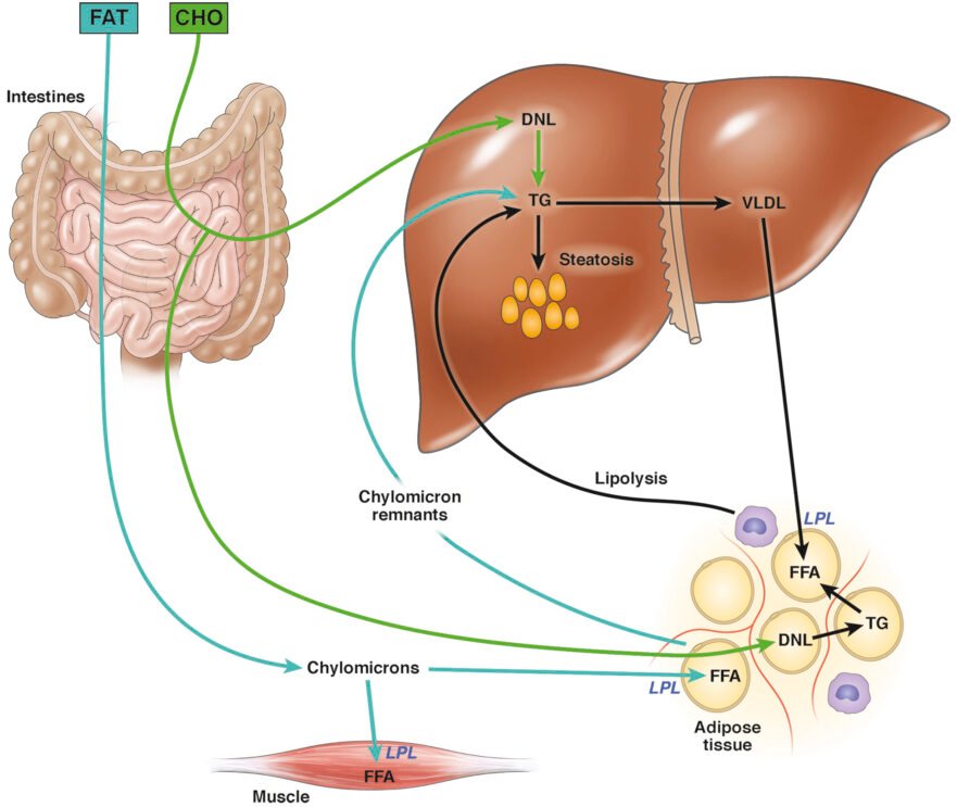 The ranges listed above reflect the wide variability that is due to the metabolic health of the individual, in addition to dietary composition. Increased intra-hepatic triglycerides (fat in the liver cells) and consequent hepatic and adipose tissue insulin resistance results in increased concentrations of circulating non-esterified fatty acids (NEFA) in the postprandial period, upregulating triglyceride synthesis and impairing postprandial TG clearance. In addition to increased TG synthesis from increased circulating NEFA, de novo lipogenesis of liver TGs may be increased from carbohydrate overfeeding, and exacerbated by the presence of fatty liver. Thus, both dietary fat and carbohydrate influence the accumulation of liver fat.