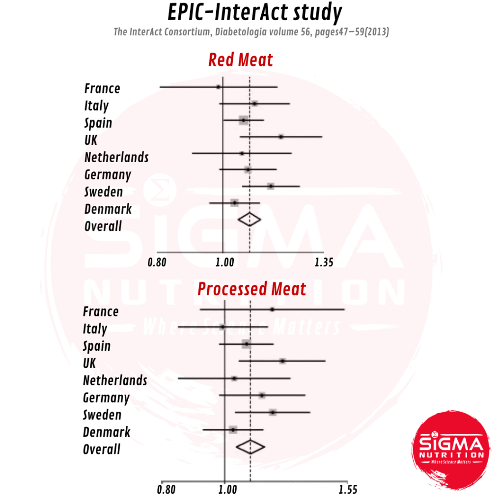 While CVD and cancer are both common outcomes of interest, type-2 diabetes also exhibits a relationship with red meat intake. The EPIC-InterAct study, a case-cohort nested within the EPIC study investigating the relationship between lifestyle and T2DM, included a sub-group of 15,258 participants selected from the overall EPIC cohort. In this sub-cohort, the association with T2DM was moderately significant. Mean total meat intake ranged from the lowest quintile of 50.4g/d to 186.0g/d in the highest quintile. :