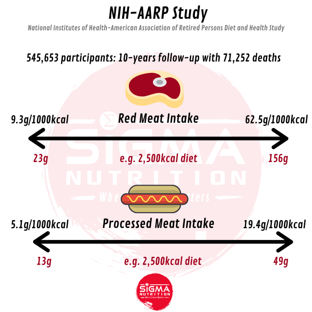 The NIH-AARP cohort included up to 545,653 participants in analysis, with a range of red meat intake of 9.3g/1000kcal to 62.5g/1000kcal. For a 2,500kcal diet, this would equate to an absolute intake ranging from about 23g per day at the low end, to 156g per day at the upper end. Processed meat ranged from 5.1g/1000kcal to 19.4g/1000kcal. At 10-years follow-up, including 47,976 and 23,276 male and female deaths, respectively.