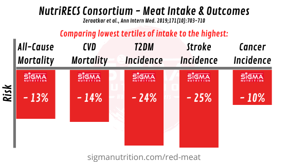 A 2017 paper from the same cohort (with a median follow-up of 15.6yrs, 7.5 million person-years of follow-up in which 128,524 participants died), comparing the highest vs. lowest intake of red meat resulted in a 26% relative risk increase (95% CI 1.23-1.29). This updated analysis examined the associations between mediators, in particular heme iron, processed meat nitrates, and processed meat nitrites, finding that: