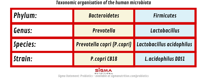 Understanding the taxonomic organisation to the microbiota relates to the evidence for the role of probiotics in various disease states, because the evidence suggests that efficacy is strain-specific, and thus formulations with single species or combinations of species may have no significant efficacy.